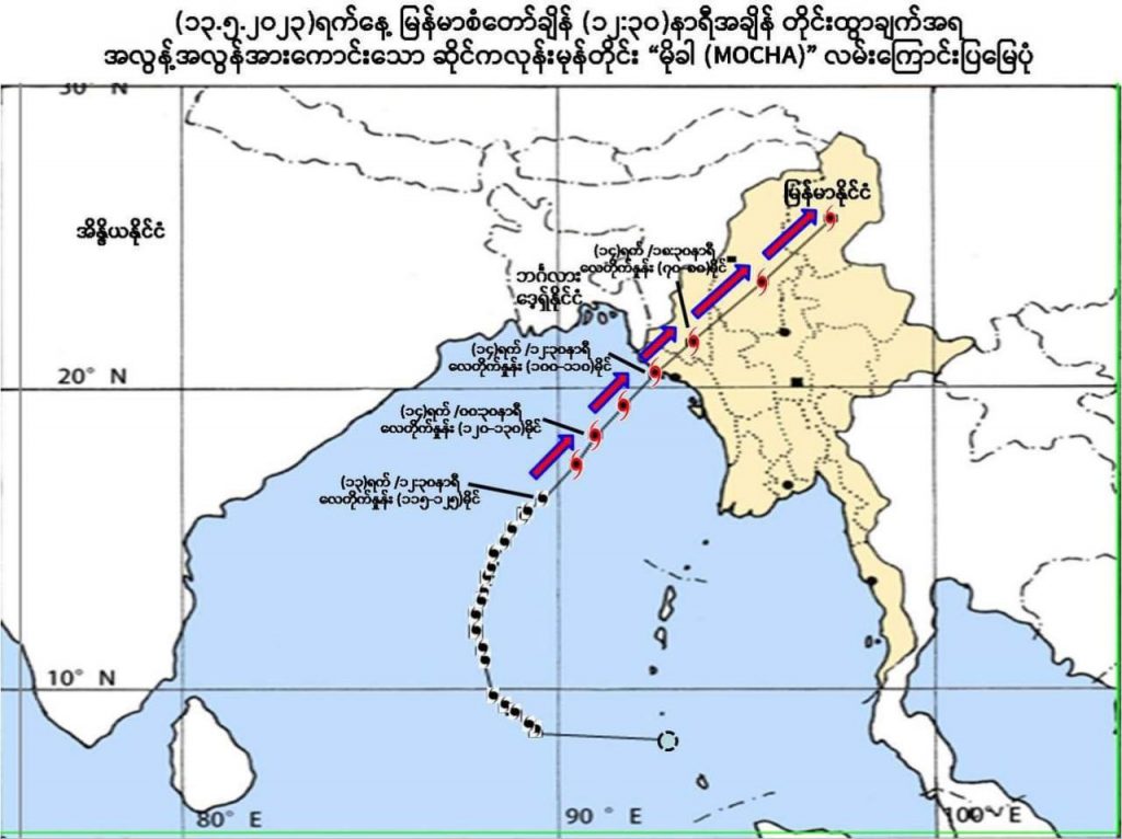 ယနေ့ မေလ (၁၃)ရက်နေ့၊မြန်မာစံတော်ချိန် (၁၄:၀၀)နာရီအချိန်ထုတ်ပြန်သည့် အလွန့်အလွန်အားကောင်းသောဆိုင်ကလုန်းမုန်တိုင်းသတိပေးချက်အမှတ်စဉ်(၁၉/၂၀၂၃) ပါ။