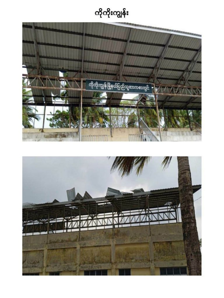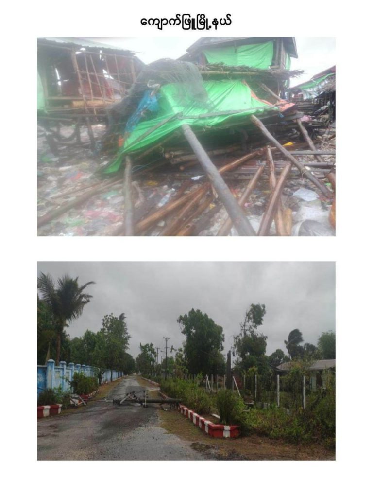 ဆိုင်ကလုန်းမုန်တိုင်း မိုခါ(MOCHA) ဝင်ရောက်တိုက်ခိုက်မှုကြောင့် သံတွဲ၊ ဂွ၊ ကျောက်ဖြူ၊ စစ်တွေ၊ ကိုးကိုးကျွန်းမြိုများ၌ လူနေအိမ်များ၊ ဌာနဆိုင်ရာ အဆောက်အဦများ ပျက်စီးဆုံးရှုးခဲ့ကြောင်း နစက သတင်းထုတ်ပြန်ရေးအဖွဲ့မှ သိရပါတယ်။ မုန်တိုင်းဒဏ်သင့်ခံရတဲ့နေရာတွေကိုလည်း ကယ်ဆယ်ရေးအဖွဲ့တွေ ဌာနဆိုင်ရာတာဝန်ရှိအဖွဲ့အစည်းတွေ လုံခြုံရေးအဖွဲ့တွေသွားရောက် ကူညီကယ်ဆယ်ရေးလုပ်ငန်းများကို ဆောင်ရွက်နေပြီဖြစ်ကြောင်းသိရပါတယ်။