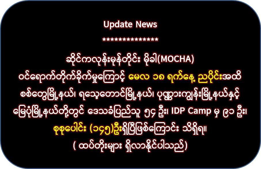 ဆိုင်ကလုန်းမုန်တိုင်း မိုခါ ဝင်ရောက် တိုက်ခတ်မှုကြောင့် ရခိုင်ပြည်နယ်အတွင်း၌ IDP Camp အပါ ဒေသခံပြည်သူ စုစုပေါင်း ၁၄၅ ဦး သေဆုံးခဲ့ရကြောင်းသိရှိရပါတယ်။