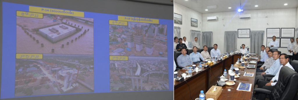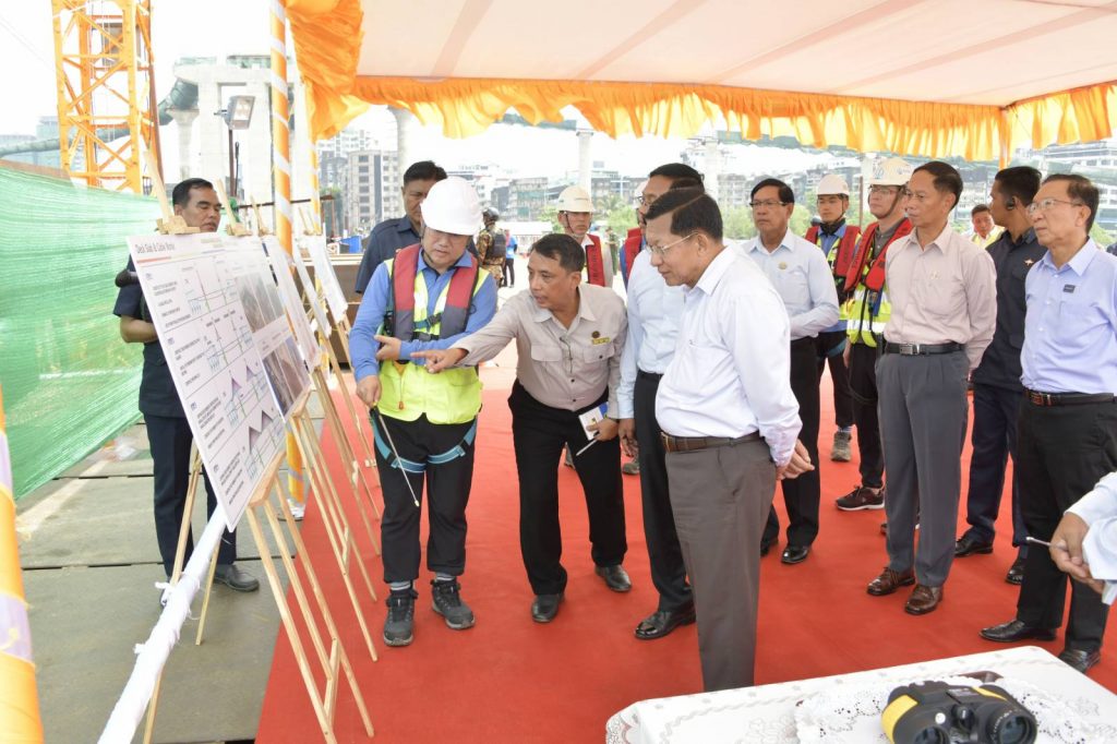 ယင်းနောက် နိုင်ငံတော်စီမံအုပ်ချုပ်ရေးကောင်စီဥက္ကဋ္ဌ နိုင်ငံတော်ဝန်ကြီးချုပ်နှင့် အဖွဲ့ဝင်များသည် တံတားတည်ဆောက်ရေးစီမံကိန်းရှိ ရန်ကုန်ဘက်ခြမ်း Main Bridge Pylon 2 နေရာတွင် လုပ်ငန်းဆောင်ရွက်နေမှု အခြေအနေများကို လိုက်လံ ကြည့်ရှု စစ်ဆေးရာ တာဝန်ရှိသူများ၏ ရှင်းလင်းတင်ပြမှုများအပေါ် လိုအပ်သည်များ လမ်းညွှန်မှာကြားသည်။