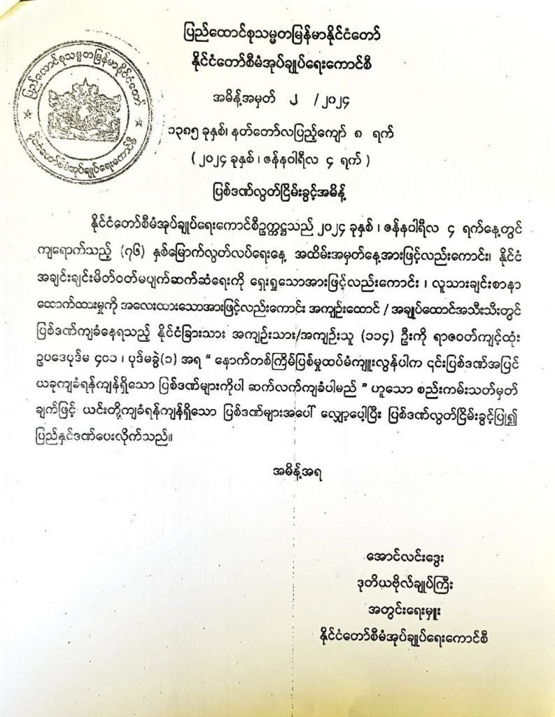(၇၆)နှစ်မြောက်လွတ်လပ်ရေးနေ့အထိမ်းအမှတ်အဖြစ်နဲ့ ပြည်သူလူထုနှလုံးစိတ်ဝမ်းအေးချမ်းစေရေးနဲ့ လူသားချင်းစာနာထောက်ထားမှုကိုအလေးထားတဲ့အနေနဲ့ နိုင်ငံတော်စီမံအုပ်ချုပ်ရေးကောင်စီက အကျဉ်းထောင်/အချုပ်ထောင်စခန်းအသီး သီးမှာ ပြစ်ဒဏ်ကျခံနေရတဲ့ အကျဉ်းသား/အကျဉ်းသူ ၉၆၅၂ ယောက်ကို ရာဇဝတ် ကျင့်ထုံးဥပဒေပုဒ်မ ၄၀၁၊ ပုဒ်မခွဲ ၁ အရ နောက်တစ်ကြိမ် ပြစ်မှုကျူးလွန်ပါက ကျန်ရှိနေတဲ့ ပြစ်ဒဏ်တွေကို ဆက်လက် ကျခံရမယ်ဆိုတဲ့ စည်းကမ်း သတ်မှတ်ချက်နဲ့ ပြစ်ဒဏ်တွေလျှော့ပေါ့ပြီး ပြစ်ဒဏ်လွတ်ငြိမ်းခွင့်ပြုလိုက်တာလို ထုတ်ပြန်ချက်အရ သိရပါတယ်။