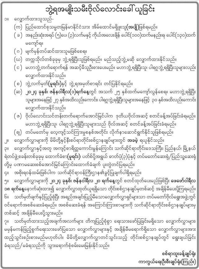 ဘွဲ့ရအမျိုးသမီးဗိုလ်လောင်းလျှောက်လွှာများကို ၂၀၂၄ခုနှစ်၊ဇန်နဝါရီလ ၂၀ရက်နေ့တွင် စတင်ထုတ်ပေးမည်ဖြစ်ပြီး ဖေဖော်ဝါရီလ ၁၈ရက်နေ့နောက်ဆုံးထား၍ လျှောက်လွှာထုတ်ယူရရှိသောတိုင်းစစ်ဌာနချုပ်မှတဆင့်အချိန်မီပေးပိုရမည်ဖြစ်ပါတယ်။