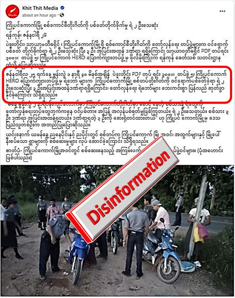 ဇန်နဝါရီလ၂၅ ရက်နေ့၌ ပဲခူးတိုင်း၊ သာယာ၀တီခရိုင်၊ ကြိုပင်ကောက်မြို့ တိုးဂိတ်တွင် လုံခြုံရေးလုပ်နေတဲ့ ရဲတပ်ဖွဲ့ဝင်များကို PDF အဖွဲ့က ချောင်းပစ်ထွက်ပြေးသွားခြင်းဖြစ်ပြီး ထိခိုက်မှုမရှိခဲ့သော်လည်း Khit Thit မှ ရဲ ၂ ဦး သေဆုံးကာ ၃ ဦး ဒဏ်ရာရတယ်ဆိုပြီး အခြေအမြစ်မရှိ လိမ်ညာရေးသားထားခြင်းသာဖြစ်ပါတယ်။