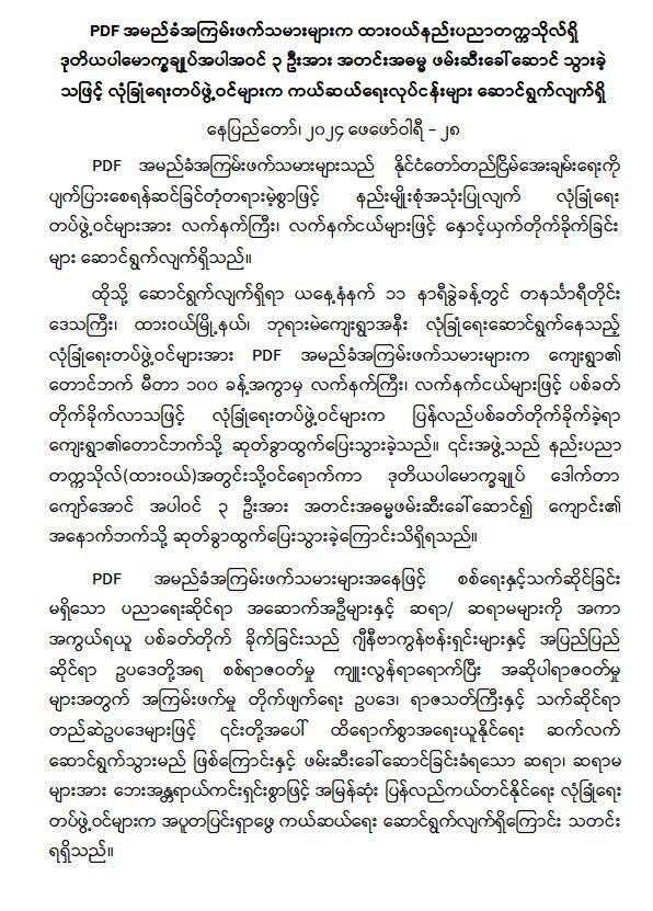 အဲ့ဒီ အကြောင်းနဲ့ ပတ်သက်ပြီး ဒေသခံတယောက်က ” ထားဝယ် နည်းပညာတက္ကသိုလ်ဆိုတာ မြိုနဲ့ ၇ မိုင်လောက်ဝေးတယ် ၊ ဒီမနက်ပိုင်းက အဲ့ဒီ နည်းပညာတက္ကသိုလ်ထဲကို ဒေသတွင်း လက်နက်ကိုင် PDF အဖွဲတွေဝင်ရောက်လာပြီး ပါမောက္ခချုပ် အပါအဝင် ဆရာ၊ ဆရာမ သုံးယောက်ထက်မနည်းကို ဖမ်းဆီးစစ်ဆေးနေတယ်” လို့ ပြောပါတယ်။