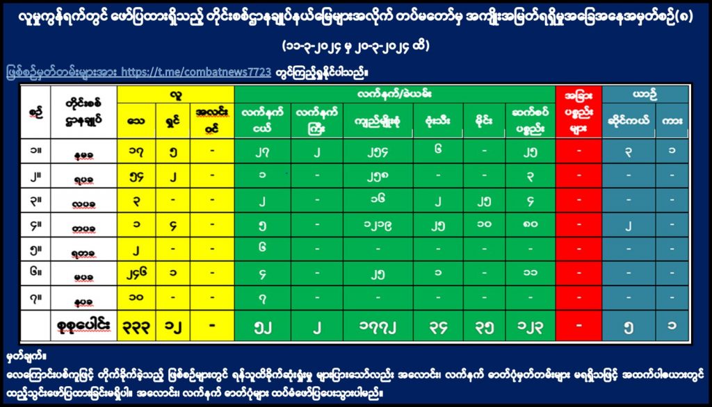 ၁၁-၃-၂၀၂၄ ရက်မှ ၂၀-၃-၂၀၂၄ ထိ ၁၀ရက်တာ ကာလအတွင်း တပ်မတော်နှင့် PDF / အခြားလက်နက်ကိုင်အကြမ်းဖက်သောင်းကျန်းသူများ၏ တိုက်ပွဲများတွင် တပ်မတော်မှ အကျိုးအမြတ်ရရှိမှုများပဲ ဖြစ်ပါတယ်။ ၁၀ ရက်အတွင်း အကြမ်းဖက်သမား သေဆုံးမှုအနေဖြင့် ၃၃၃ ဦး နှင့် အရှင်ဖမ်းဆီးရမိ ၁၂ ဦးရှိကြောင်း သိရှိရပါတယ်။