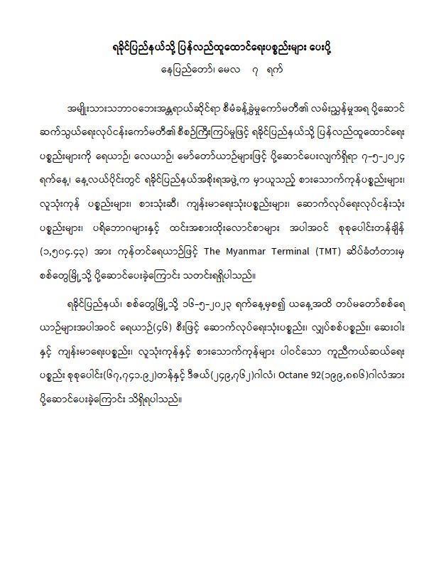 မေလ ၇ရက်က အမျိုးသားသဘာဝ ဘေးအန္တရာယ်ဆိုင်ရာ စီမံခန့်ခွဲမှုကော်မတီ၏ လမ်းညွှန်မှုအရ ပို့ဆောင်ဆက်သွယ်ရေးလုပ်ငန်းကော်မတီကြီးကြပ်၍ ရခိုင်ပြည်နယ်သို့ စားသောက်ကုန်၊ လူသုံးကုန်၊ စားသုံးဆီ၊ ကျန်းမာရေးသုံးပစ္စည်းများ၊ ဆောက်လုပ်ရေးလုပ်ငန်းသုံးများ၊ ပရိဘောဂနှင့် ထင်းအစားထိုးလောင်စာများ အပါအဝင် စုစုပေါင်းတန်ချိန် ၁၅၀၄.၄၃ အား စစ်တွေမြို့သို့ ပို့ဆောင်ပေးခဲ့ကြောင်းသိရပါတယ်