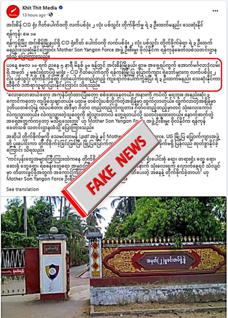 မေလ ၁၀ ရက်နေ့ ရန်ကုန်မြို့၊ အင်းစိန်မြို့နယ်ရှိ CID ရုံးဂိတ်တွင် ဗုံးပစ်သွင်းတိုက်ခိုက်ခံရတဲ့ဖြစ်စဉ်မရှိသော်လည်း Khit Thit Media မှ CID ရုံးဂိတ်နေရာ ဗုံးပစ်သွင်းတိုက်ခိုက်ခံရလို့ ရဲတပ်ဖွဲ့ဝင် ၃ ဦး သေဆုံးခဲ့တယ်ဆိုပြီး လုပ်ဇာတ်ဆင်ကာ စိတ်ကူးယဉ်ရေးသားထားခြင်းသာ ဖြစ်ပါတယ်။