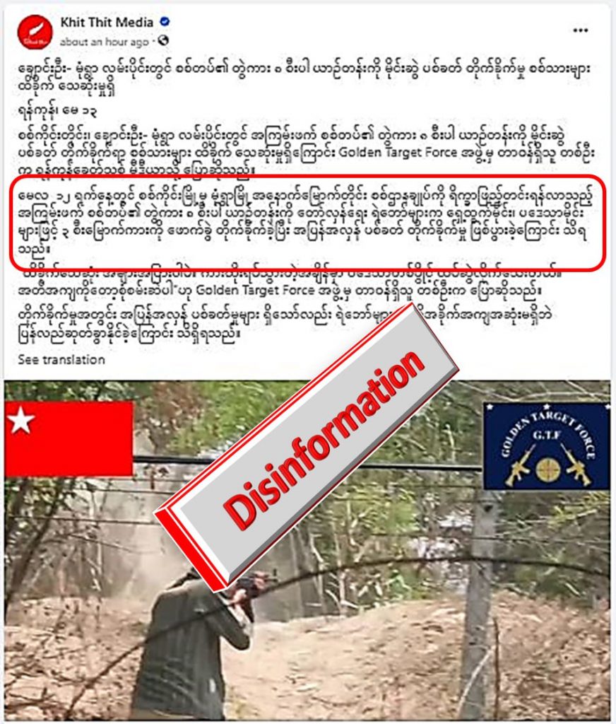 မေလ ၁၂ ရက်နေ့ မုံရွာမြို့နယ် ချောင်းဦး-မုံရွာကားလမ်းတွင် ဦးပိုင်ကုမ္ပဏီမှ ကားများအား PDF အကြမ်းဖက်အဖွဲ့က မိုင်းခွဲတိုက်ခိုက်ခြင်းဖြစ်ပြီး လုံခြုံရေးတပ်ဖွဲ့ဝင်များ ထိခိုက်မှုမရှိသော်လည်း Khit Thit Media မှ ပုံကြီးချဲ့၍ လုံခြုံရေးတပ်ဖွဲ့ဝင် အများအပြားသေဆုံးခဲ့တယ်ဆိုပြီး အမြတ်ထုတ်ကာ လိမ်ညာရေးသားထားခြင်းသာ ဖြစ်ပါတယ်။
