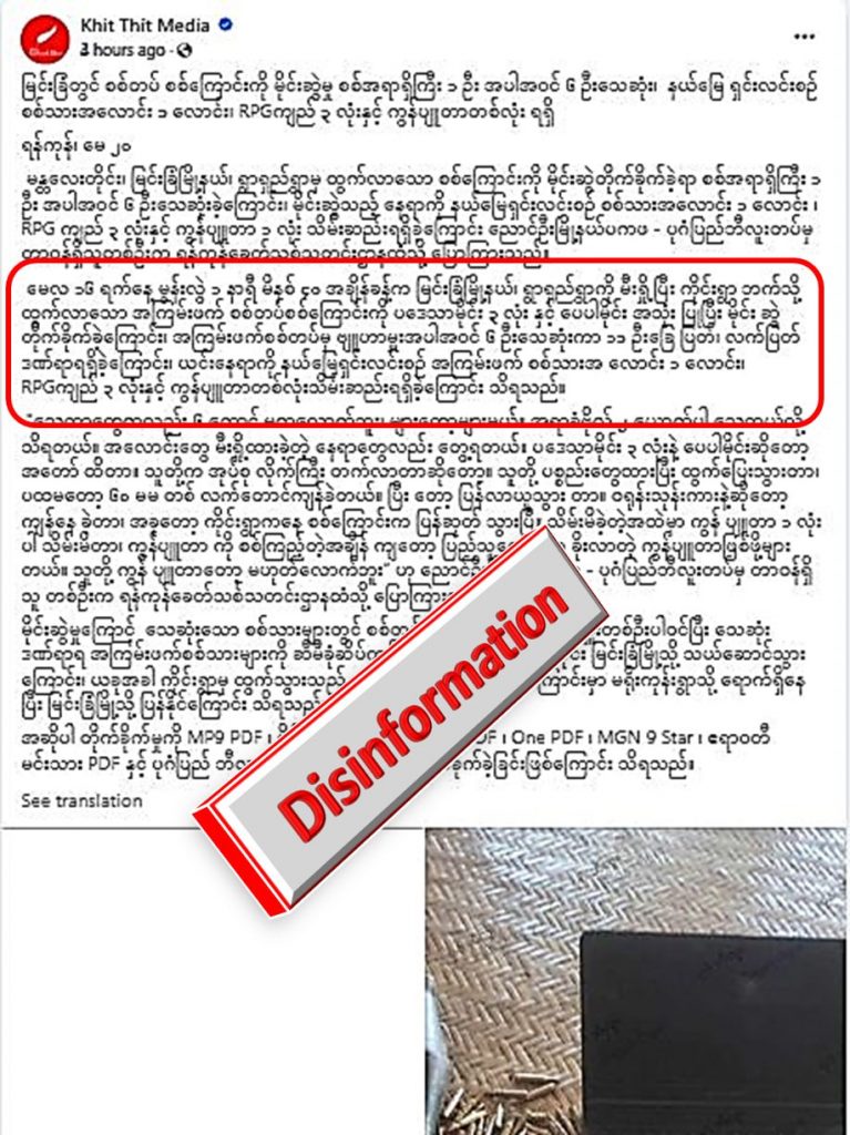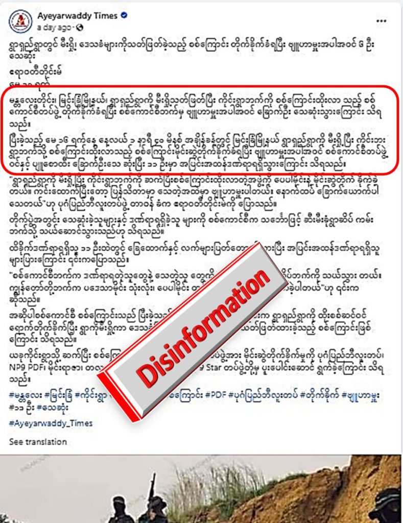 မေလ ၁၆ ရက်နေ့ မြင်းခြံမြို့နယ်၊ ကိုင်းရွာအနီးတွင် လုံခြုံရေးတပ်ဖွဲ့ဝင်များအား PDF အကြမ်းဖက်အဖွဲ့က မိုင်းဆွဲတိုက်ခိုက်ခဲ့သဖြင့် လုံခြုံရေးတပ်ဖွဲ့ဝင်၂ ဦး သာ ထိခိုက်ဒဏ်ရာရရှိခဲ့သော်လည်း Khit Thit Media နှင့် Ayeyarwaddy Times တို့မှ ဖြစ်စဉ်ကို ပုံကြီးချဲ့၍ တပ်မတော်မှ ဗျူဟာမှူးအပါ ၆ ဦး သေဆုံးခဲ့တယ်ဆိုပြီး အမြတ်ထုတ်ကာ လိမ်ညာရေးသားထားခြင်းသာ ဖြစ်ပါတယ်။