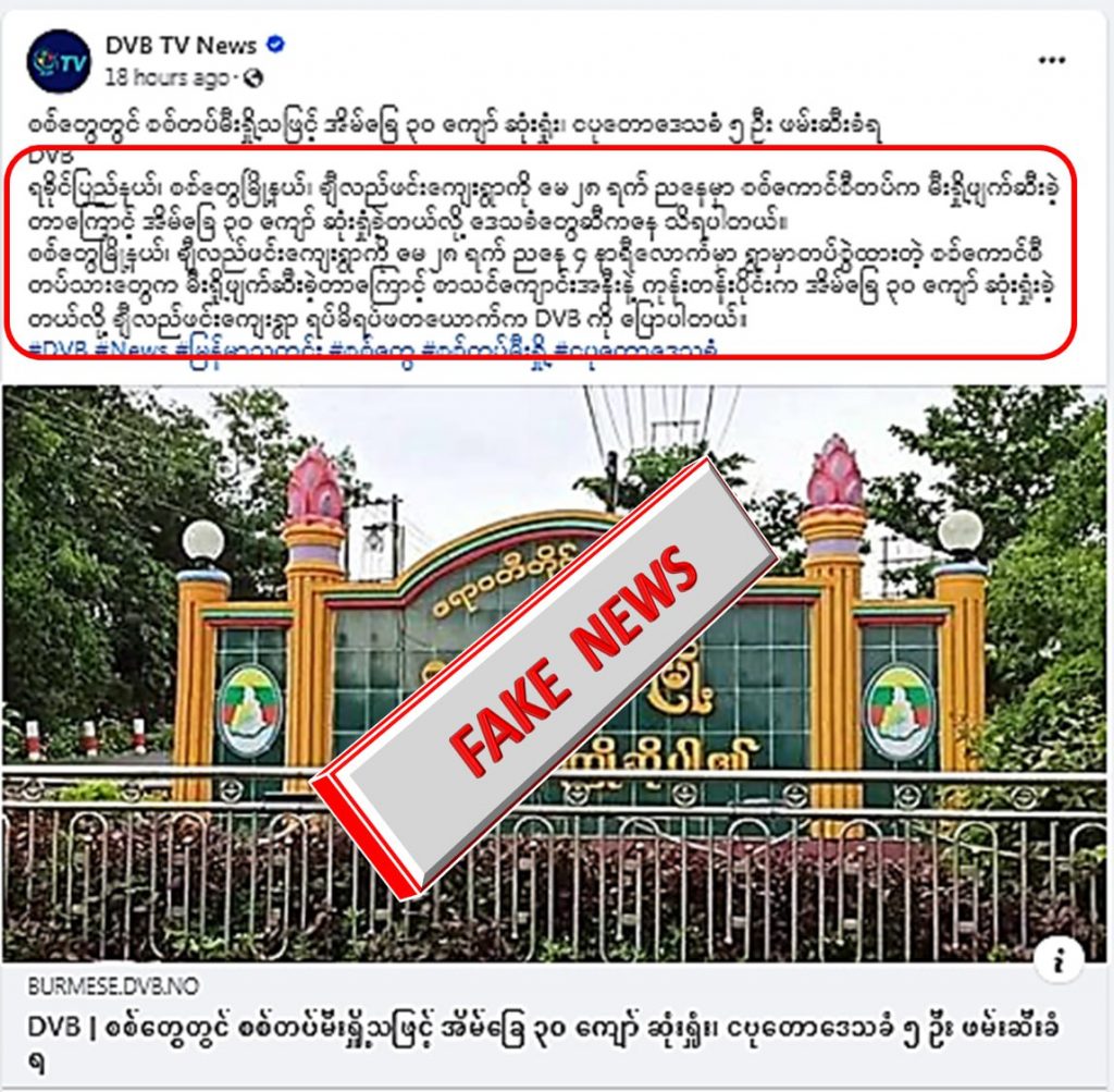 မေလ ၂၈ ရက်နေ့ ရခိုင်ပြည်နယ်၊ စစ်တွေမြို့နယ်၊ ချီလည်ဖင်းကျေးရွာတွင် မီးလောင်တဲ့ဖြစ်စဉ်နှင့် မီးရှို့ခံရတဲ့ဖြစ်စဉ်များ မရှိသော်လည်း DVB မှ လုံခြုံရေးတပ်ဖွဲ့ဝင်များအား အများပြည်သူများ အထင်လွဲမှားပြီး မုန်းတီးစေရန် နေအိမ်များကို မီးရှို့တယ်ဆိုပြီး လုပ်ဇာတ်ဆင်ကာ အပုပ်ချရေးသားထားခြင်းသာဖြစ်ပါတယ်။