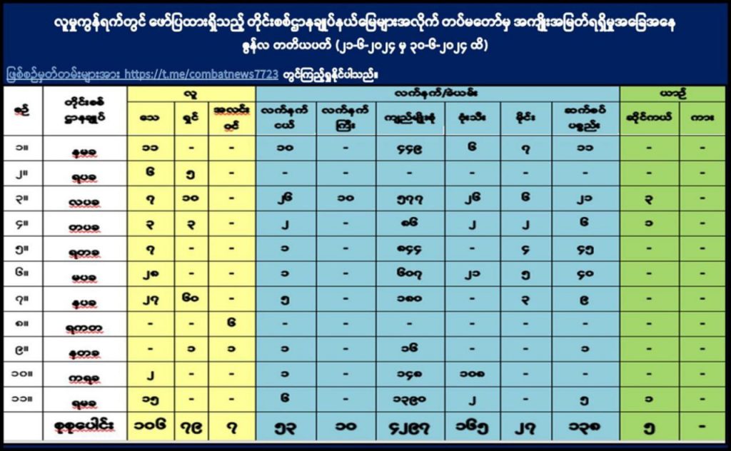 ဇွန်လ ၂၁ ရက်နေ့မှ ၃၀ ရက်နေ့အတွင်း ဖြစ်ပွားခဲ့သည့်တိုင်းစစ်ဌာနချုပ်နယ်မြေအသီးသီးရှိ နေရာအချို့တွင် လုံခြုံရေးတပ်ဖွဲ့ဝင်များနှင့် သောင်းကျန်းသူများထိတွေ့မှုများဖြစ်ပွားခဲ့ပြီး PDF အပါအဝင် လက်နက်ကိုင် သောင်းကျန်းသူ သေဆုံး ၁၀၆ ဦးနှင့် လက်ရဖမ်းဆီးရမိ ၇၉ ဦး ရှိကြောင်း သိရပါတယ်။