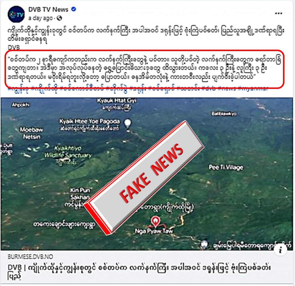 ဇူလိုင်လ ၆ ရက်နေ့ ကျိုက်ထိုမြို့ တဂေးချောင်းဖျားရွာနှင့် မောင်တူးကုန်းရွာတို့တွင် လုံခြုံရေးတပ်ဖွဲ့ဝင်များ လက်နက်ကြီးပစ်ခတ်ခြင်းမရှိခဲ့သော်လည်း DVB မှ တပ်မတော်က ပစ်ခတ်သော လက်နက်ကြီးကျည် ကျရောက်ပေါက်ကွဲသဖြင့် ပြည်သူ ၆ ဦး ဒဏ်ရာရခဲ့တယ်ဆိုပြီး လုပ်ဇာတ်ဆင်ကာ အပုပ်ချရေးသားထားခြင်းဖြစ်ပါတယ်။