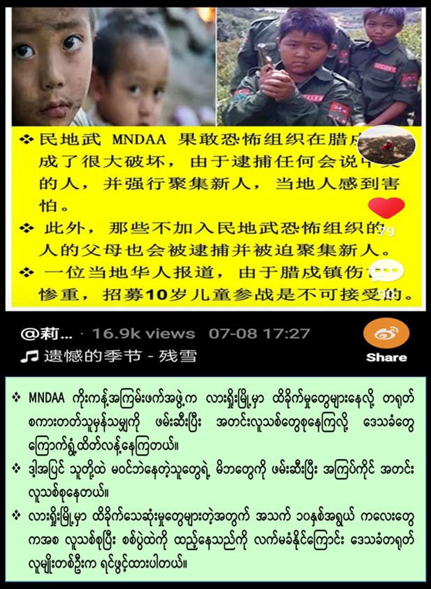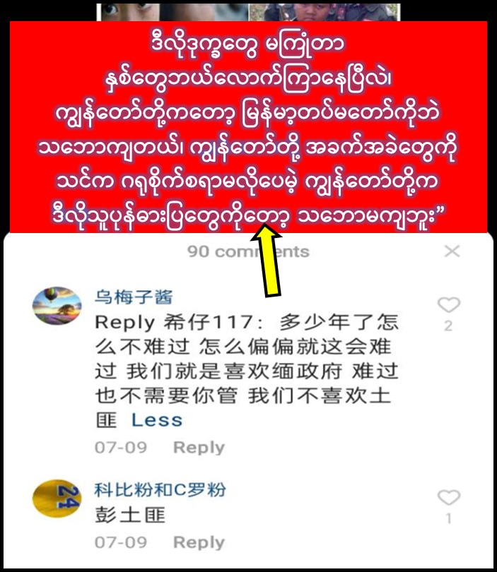 Kuaishou ဒီကွန့်မန့်လေးကလည်း သဘောကျစရာကောင်းလို့ ဘာသာပြန်တင်ပေးလိုက်ပါတယ်။ အကြမ်းဖက် လက်နက်ကိုင် MNDAA များအနေဖြင့် ဒေသခံပြည်သူတွေအပေါ် အနိုင်ကျင့်ဗိုလ်ကျနေမှုတွေကို လူမှုကွန်ယက်များတွင် ရင်ဖွင့်ရေးသားထားကြတဲ့ စာများပဲ ဖြစ်ပါတယ်။ သူတို့တွေကလည်း မြန်မာ့တပ်မတော်ကို အားပေးနေတယ် .. သူတို့ရဲ့အခက်အခဲကို ဂရုမစိုက်ပါနဲ့ .. သူပုန်ဓားပြတွေကို မုန်းပါတယ်တဲ့။