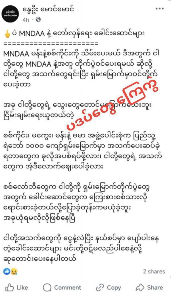 အကြမ်းဖက်လက်နက်ကိုင်သက်တမ်းကြာမြင့်နေပြီး တပ်မတော်ကိုတိုက်ခိုက်နေတဲ့ MNDAA ဟာ အညာသား PDF များကိုစည်းရုံးအသုံးချ မျှော်လင့်ချက်အမှားတွေပေးပြီး တိုက်ပွဲမှာ အသုံးချခဲ့ကြတယ်။ လက်နက်ကိုင်တိုက်ပွဲဖြစ်စဉ်များမှာ ရှေ့တန်းပို့ ထိပ်ဆုံးကအသေခံခိုင်းလာခဲ့ရာမှ အခုတော့ မျှော်လင့်ချက်တွေမဲ့သွားရပြီး အညာသား PDF တော်တော်များများလည်း တိုက်ပွဲအတွင်းများ သေဆုံးကုန်ကြပြီ။