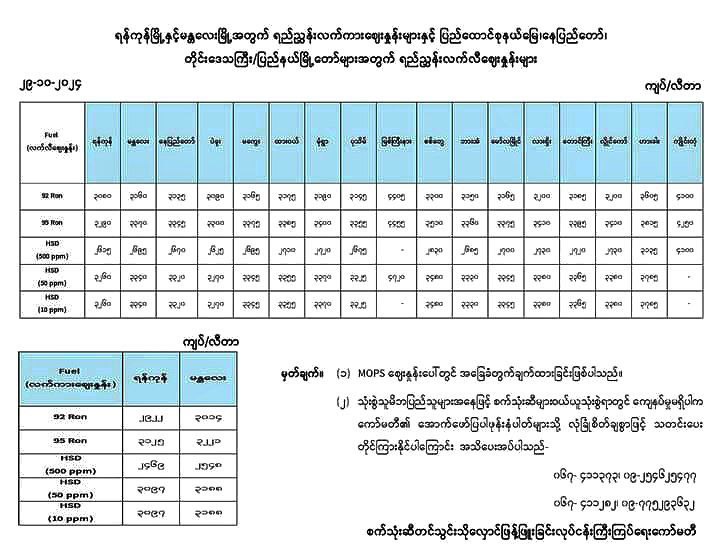 စက်သုံးဆီ တင်သွင်းသိုလောင်ဖြန့်ဖြူးခြင်းလုပ်ငန်း ကြီးကြပ်ရေးကော်မတီက ယနေ့  ၂၀၂၄ ခုနှစ်၊ အောက်တိုဘာ ( ၂၉ ) ရက်နေ့မှာ ထုတ်ပြန်တဲ့ ရန်ကုန်မြို့နဲ့ မန္တလေးမြို့များအတွက် စက်သုံးဆီ ရည်ညွှန်းလက်ကားဈေးနှုန်းများနဲ့ ပြည်ထောင်စုနယ်မြေ နေပြည်တော်၊ တိုင်းဒေသကြီး/ပြည်နယ် မြို့တော်များအတွက် ရည်ညွှန်းလက်လီဈေးနှုန်းများဖြစ်ပါတယ်။