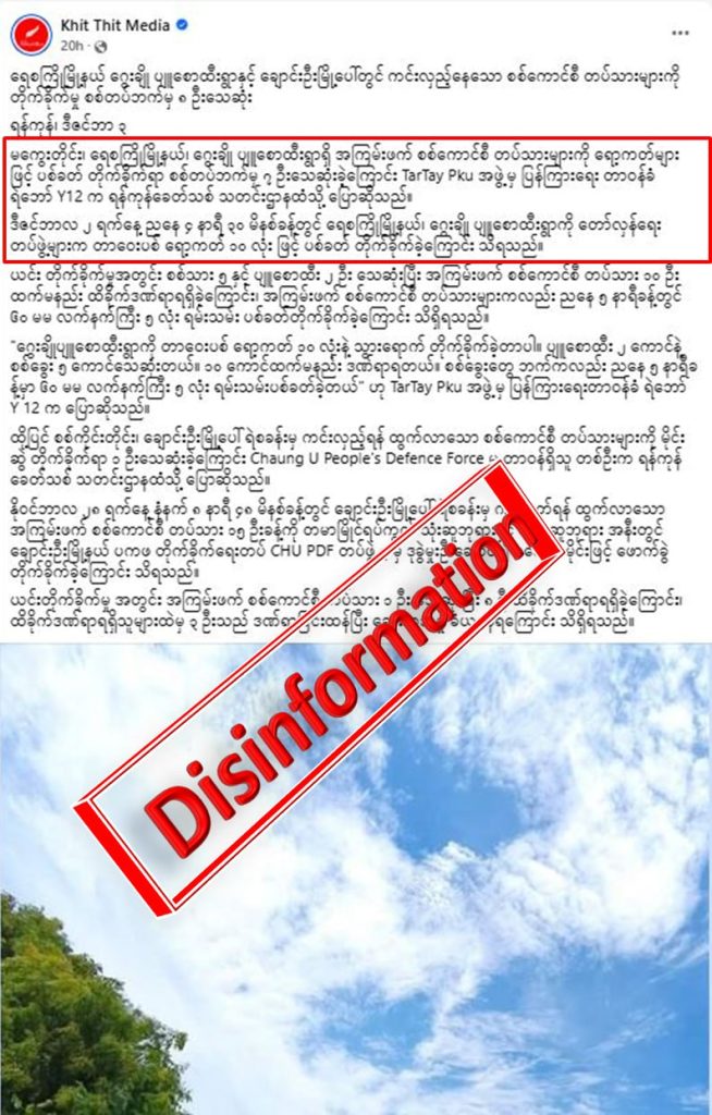 အဆိုပါ ဖြစ်စဉ်အပေါ် Khit Thit မှ သတင်းအမြတ်ထုတ်ပြီး လုံခြုံရေးတပ်ဖွဲ့ဝင် ၇ ဦးသေပြီး ၁၀ ဦးထက်မနည်းဒဏ်ရာရတယ်လို့ အပုတ်ချရေးသားထားခြင်းဖြစ်ပါတယ်။