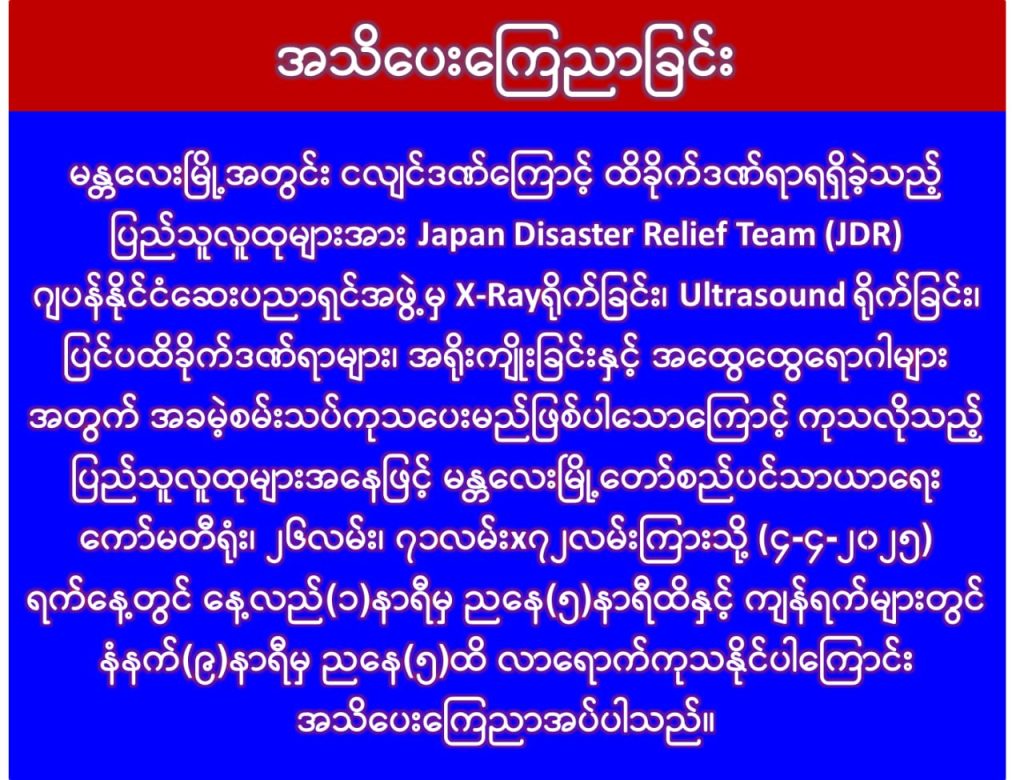 မန္တလေးမြို့အတွင်း ငလျင်ဒဏ်ကြောင့် ထိခိုက်ဒဏ်ရာရရှိခဲ့သည့် ပြည်သူလူထုများအား Japan Disaster Relife Team ဂျပန်နိုင်ငံဆေးပညာရှင်အဖွဲ့မှ ယနေ့မှစ၍ ၂၆ လမ်း ၇၁ လမ်း ၇၂ လမ်းကြားတွင် နေ့လည် ၁ နာရီမှ ညနေ ၅ နာရီအထိ X-RAY ရိုက်ခြင်း၊ Ultrasound ရိုက်ခြင်းများအား အခမဲ့စမ်းသပ်ကုသပေးမည်ဖြစ်ကြောင်း သိရှိရသည်။