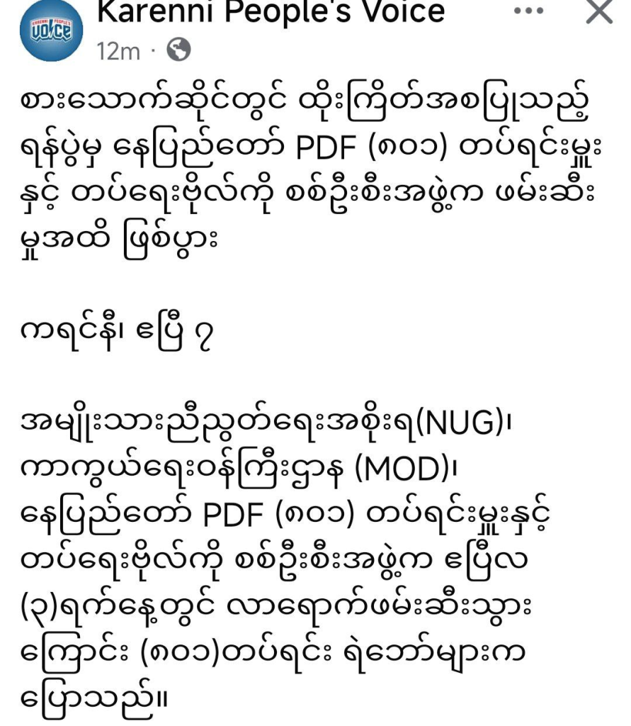 အကြမ်းဖက် NUG လက်အောက်ခံ PDF တပ်ရင်းတစ်ခုဖြစ်သည့်နေပြည်တော် PDF အဖွဲ့ဝင်များ စားသောက်ဆိုင်တစ်ခုအတွင်း ထိုးကြိတ်ရန်ဖြစ်ပွားခဲ့တာကြောင့် နေပြည်တော် PDF ခေါင်းဆောင်ဆိုသူနှင့်လက်အောက်ငယ်သားအချို့ကို NUG ရဲ့ စစ်ဦးစီးအဖွဲ့ဖမ်းဆီးသွားခဲ့တယ်လို့ သိရပါတယ်။ ပြည်သူ့အတွက်ဆိုပြီး အခုခုတော့ အချင်းချင်းကို စားခွက်လုရင်းကိုက်ကုန်ကြပြီ…