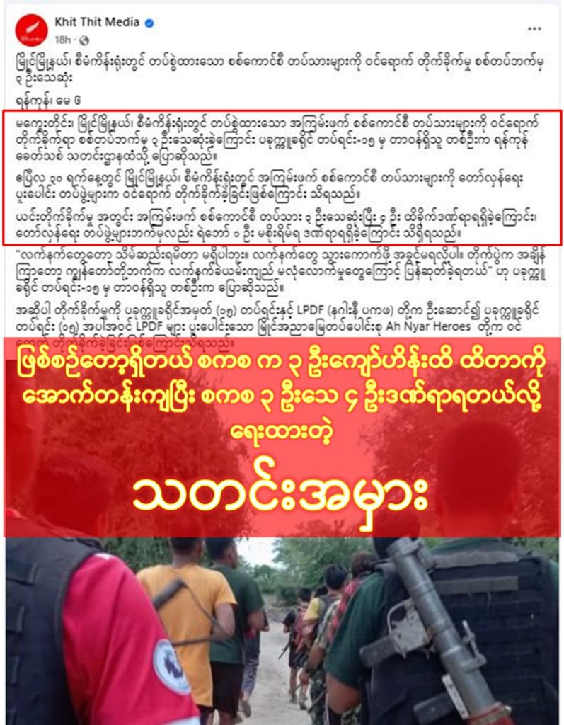 ဧပြီလ ၃၀ ရက်နေ့တွင် မကွေးတိုင်း၊ မြိုင်မြို့နယ်၊ စီမံကိန်းရုံးတွင် လုံခြုံရေးတပ်ဖွဲ့ဝင်များအား PDF အကြမ်းဖက်အဖွဲ့များမှ လာရောက်တိုက်ခိုက်စဉ် အပြန်အလှန်ပစ်ခတ်မှုဖြစ်ပွားခဲ့ပြီး လုံခြုံရေးတပ်ဖွဲ့ဝင် ၃ ဦး ထိခိုက်ဒဏ်ရာရရှိခဲ့သည်ကို Khit Thit မှ ဖြစ်စဉ်အမှန်မရေးဘဲ လူအထင်ကြီးအောင် ၃ ဦးသေဆုံးပြီး ၄ ဦးဒဏ်ရာရတယ်လို့ အောက်တန်းကျစွာ ဗြောင်လိမ်ရေးသားထားတဲ့ သတင်းအမှားသာဖြစ်ပါတယ်#crd
