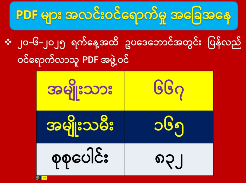 အကြမ်းဖက်လုပ်ရပ်များကို စွန့်ခွာပြီး ဥပဒေဘောင်အတွင်း ပြန်လည်ဝင်ရောက်လာသူ ဇွန်လ ၂၀ ရက်အထိ PDF အဖွဲ့ဝင် အမျိုးသား ၆၆၇ ဦးနှင့် အမျိုးသမီး ၁၆၅ ဦး၊ စုစုပေါင်း ၈၃၂ ဦးရှိပြီဖြစ်ကြောင်း သိရှိရသည်။
