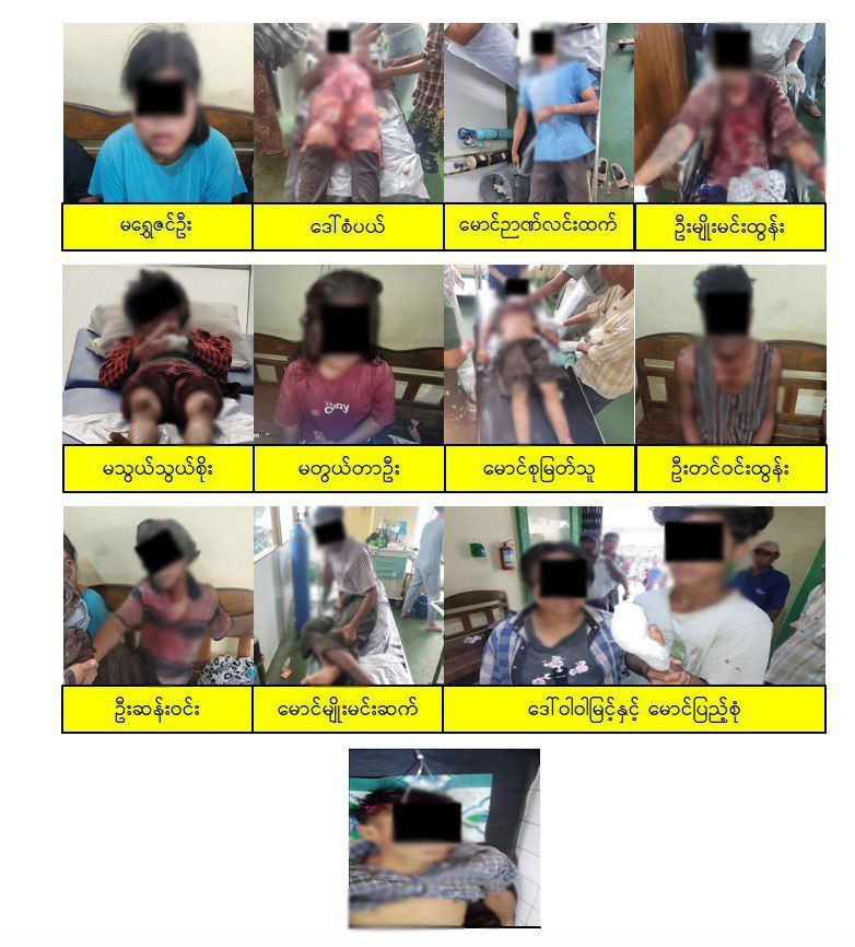အလားတူ ကိုသော်တာဦး(၂၂)နှစ်၊ ဒေါ်ခင်ရွှေ(၇၀)နှစ်၊ ဦးဆန်းဝင်း (၅၆)နှစ်၊ မောင်မျိုးမင်းဆက်(၂၄)နှစ်၊ မောင်ဉာဏ်လင်းထက်(၂၂)နှစ်၊ မောင်ပြည့်စုံ(၁၈)နှစ်၊ ဦးတင်ဝင်းထွန်း(၄၄)နှစ်၊ ဦးမျိုးမင်းထွန်း(၃၇)နှစ်၊ မောင်ကောင်းခန့်သော်(၈)နှစ်၊ ဒေါ်စံပယ်(၄၃)နှစ်၊ မောင်ခန့်(ခ)ခန့်ညား(၁၇)နှစ်၊ မောင်ဘုန်းခန့်သော်(၇)လ၊ မောင်ကံထူးဝေ(၈)လ၊ မောင်စုမြတ်သူ (၁၂)နှစ်၊ မစုမြတ်မွန်(၁၀)နှစ်၊ မသွယ်သွယ်စိုး(၈)နှစ်၊ မရွှေဇင်ဦး(၂၆)နှစ်၊ မတွယ်တာဦး(၂၀)နှစ်၊ ဒေါ်ဝါဝါမြင့်(၄၉)နှစ်၊ ဒေါ်စုနွေဇင်(၃၈)နှစ်၊ ဒေါ်ဇာ(၃၄)နှစ်၊ ဒေါ်ချို(၆၀)နှစ်၊ ဝဲကြီး(မြောက်)ကျေးရွာ နေသူများဖြစ်ကြသည့် ဦးဝင်းညွန့်(၅၆)နှစ်၊ ဒေါ်ခင်ဌေး(၇၃)နှစ်နှင့် ဝဲဒေါင့်ကျေးရွာနေ ဦးနိုင်ထွန်း (၄၆)နှစ်တို့ ၂၅ ဦးတွင် ဒဏ်ရာများရရှိခဲ့ကြသဖြင့် ဖြူးမြို့နယ်ပြည်သူ့ဆေးရုံ၌ ဆေးဝါးကုသမှု ခံယူနေရသည်ဟု သိရသည်။