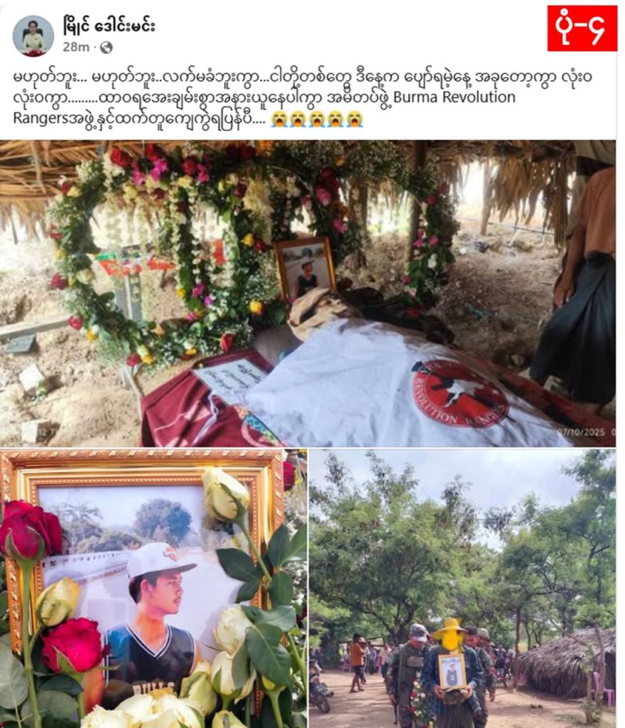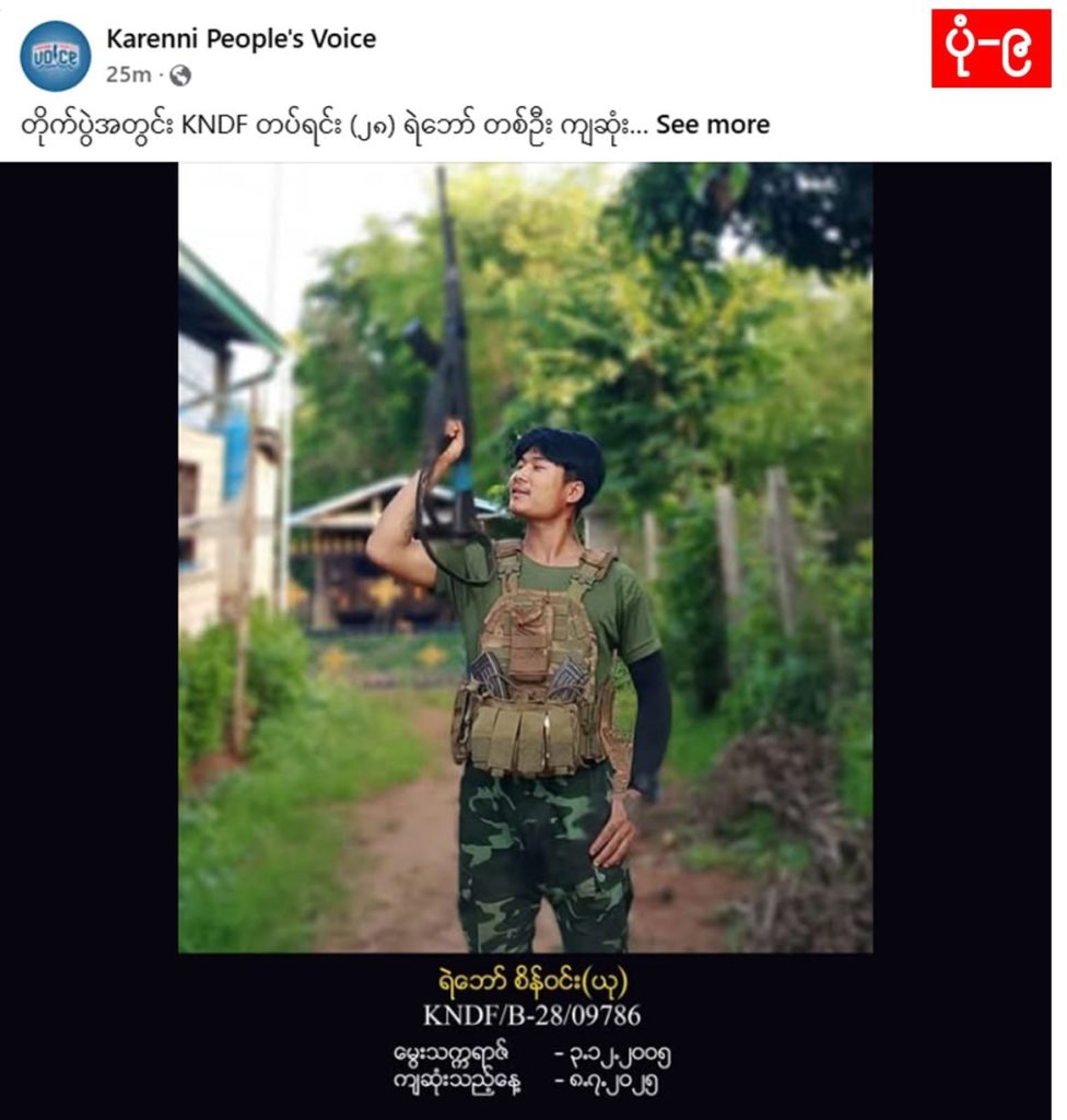ပုံ (၉) ကရင်နီပြည်နယ်၊ ရှေ့တန်းတိုက်ပွဲတစ်နေရာအတွင်း ကရင်နီအမျိုးသားများကာကွယ်ရေးတပ် (KNDF) တပ်ရင်း (၂၈) မှ ရဲဘော် စိန်ဝင်း(ယု) သေဆုံးခဲ့ကြောင်း ထုတ်ပြန်ထား။