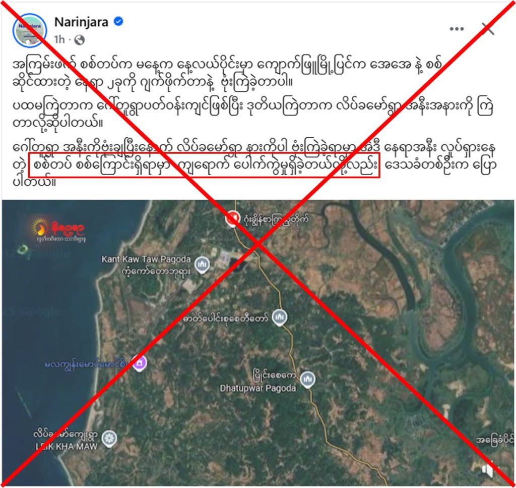 အကြမ်းဖက် AA ထောက်ခံ မီဒီယာတစ်ခုဖြစ်တဲ့ Narinjara ကနေပြီး အခြေအမြစ်မရှိတဲ့ သတင်းတစ်ခုကို တင်ထားပြီး ဝါဒဖြန့်နေတာကိုတွေ့ရပါတယ်။ စစ်တပ်က လေသူရဲတွေက မနေ့တစ်နေ့ကမှ လေယာဉ်မြင်ဖူးတဲ့သူတွေမှမဟုတ်တာ ကိုယ့်စစ်ကြောင်းရှိရာကို ဗုံးကျရောက်ပေါက်ကွဲခဲ့တယ်ဆိုပြီး မဟုတ်မမှန်ရေးသားထားပါတယ်။