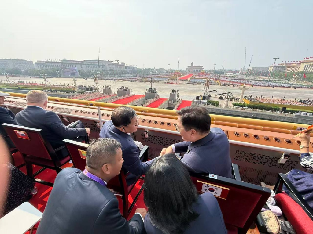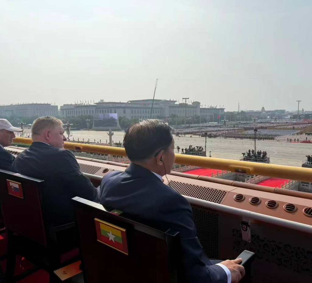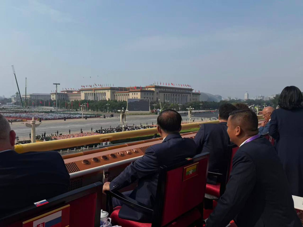 💚💚 တရုတ်နိုင်ငံ ပေကျင်းမြို၌ ကျင်းပပြုလုပ်သည့် ကမ္ဘာ့ဖက်ဆစ်ဆန့်ကျင်ရေးစစ်ပွဲ အောင်နိုင်ခြင်း နှစ်(၈၀)ပြည့် အထိမ်းအမှတ် စစ်ရေးပြအခမ်းအနားသို ပြည်ထောင်စုသမ္မတမြန်မာနိုင်ငံတော် ယာယီသမ္မတ ဗိုလ်ချုပ်မှူးကြီး မင်းအောင်လှိင် တက်ရောက်နေသည့်မြင်ကွင်း 💚💚
