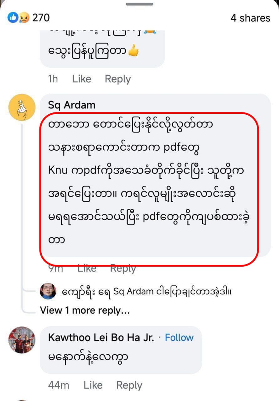 KIA က ဒီအချိုးချိုးသလို KNU လည်း ဒီအချိုး ချိုးတာပါပဲ၊ ကချင်မှာ KIA က ကချင်အလောင်းဆို ကောက်တယ်၊ ကချင်ထဲမှာမှ ဂျိမ်းဖောပဲ ရွေးကောက်တာ၊ PDF တွေကတော့ ထုံးစံအတိုင်း၊ ခွေးထိုးထိုး ကျီးစားစားဆိုပြီး ဒီအတိုင်းထားခဲ့ ကြတာချည်းပါပဲ။ -အခုလည်း KNU တွေ၊ တာဘောလို ကောင်ကတော့ ဖနောင့်နဲ့တင်ပါး တစ်သားတည်းကျအောင်ပြေးတယ်။ PDF တွေ ကို တော့ ခွေးထိုးထိုးကျီးစားစား ဆိုပြီး ပစ်ထားခဲ့ကြတယ်။-PDF တွေ နားလည်ဖို့ လိုတယ်။ အမြင်မှန်ရဖို့ လိုတယ်။ ကရင်ပြည်နယ်မှာ PDF တွေ ဘယ်လောက်အသေခံတိုက်တိုက် ဘယ် KNU မှ PDF တွေကို မြေတစ်လက်မ မပေးဘူး။-အခု အာရှလမ်းမှာ PDF တွေ ရာနဲ့ချီကျသွားတာကို သင်ခန်းစာယူဖို့လိုတယ်။ နိုင်ငံတော် အစိုးရကလည်း တံခါးဖွင့်ပေးထားတာ ဖြစ်လို့ အမြန်ဆုံးအလင်းဝင်ကြဖို့ တိုက်တွန်းချင်တယ်။