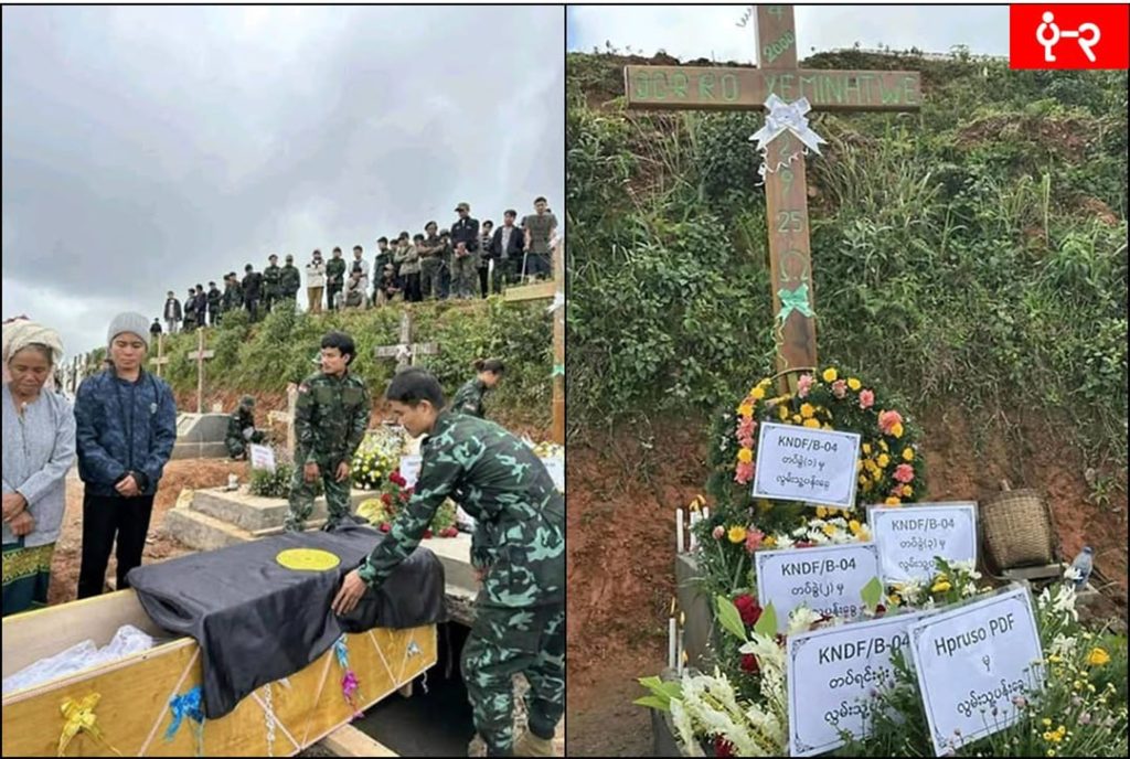ပုံ(၄)>>> ၇-၉-၂၀၂၅ ရက်နေ့ ကယားပြည်နယ်၊ ငွေတောင်ရွာသစ်တိုက်ပွဲတွင် KNDF မှ သက်အောင်(ခ)အောင်ပု သေဆုံးခဲ့ကြောင်း PDF တစ်ဦးမှ ဝမ်းနည်းကြောင်း ဖော်ပြခဲ့ပါတယ်…သေဆုံးသူကိုကြည့်ရင် အသက် ၂၀ သာရှိသေးပြီး NUG ရဲ့အသုံးချခံဘဝနဲ့ အဆုံးသတ်သွားခဲ့ပါပြီ…