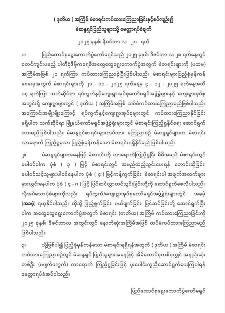 ဒီဇင်ဘာလ ၂၈ ရက်တွင် စတင်ကျင်းပမည့် ပါတီစုံဒီမိုကရေစီအထွေထွေရွေးကောက်ပွဲအတွက် မဲစာရင်းများကို မနက်ဖြန် နိုဝင်ဘာ ၂၁ ရက်နေ့မှ ဒီဇင်ဘာ ၄ ရက်နေ့အထိ ဒုတိယအကြိမ်အဖြစ် ၁၄ ရက်ကြာအောင် သက်ဆိုင်ရာ ရပ်ကွက်နှင့် ကျေးရွာအုပ်စုကော်မရှင်အဖွဲ့ခွဲများ၊ ကျေးရွာအုပ်စုအတွင်းရှိ ကျေးရွာများတွင် ထပ်မံကပ်ထားကြေညာမည်ဖြစ်ကြောင်း ပြည်ထောင်စုရွေးကောက်ပွဲကော်မရှင်က အသိပေးထုတ်ပြန်ထားသည်။