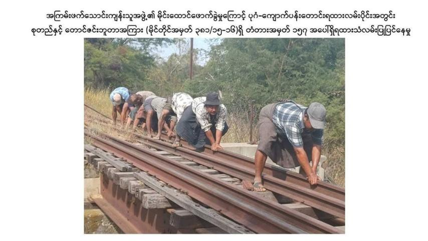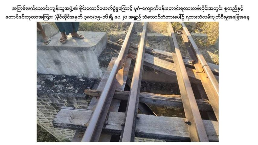 မန္တလေးတိုင်းဒေသကြီး၊ ညောင်ဦးမြို့နယ်အတွင်းက မိုင်းခွဲခံရတဲ့ ပုဂံ-ကျောက်ပန်းတောင်း ရထားလမ်းပိုင်းကို နေ့ချင်းပြီး ပြန်လည်ဖွင့်လှစ်နိုင်ခဲ့တယ်လို့ အမျိုးသားကာကွယ်ရေးနှင့်လုံခြုံရေးကောင်စီ သတင်းထုတ်ပြန်ရေး အဖွဲ့က ထုတ်ပြန်ပါတယ်။
