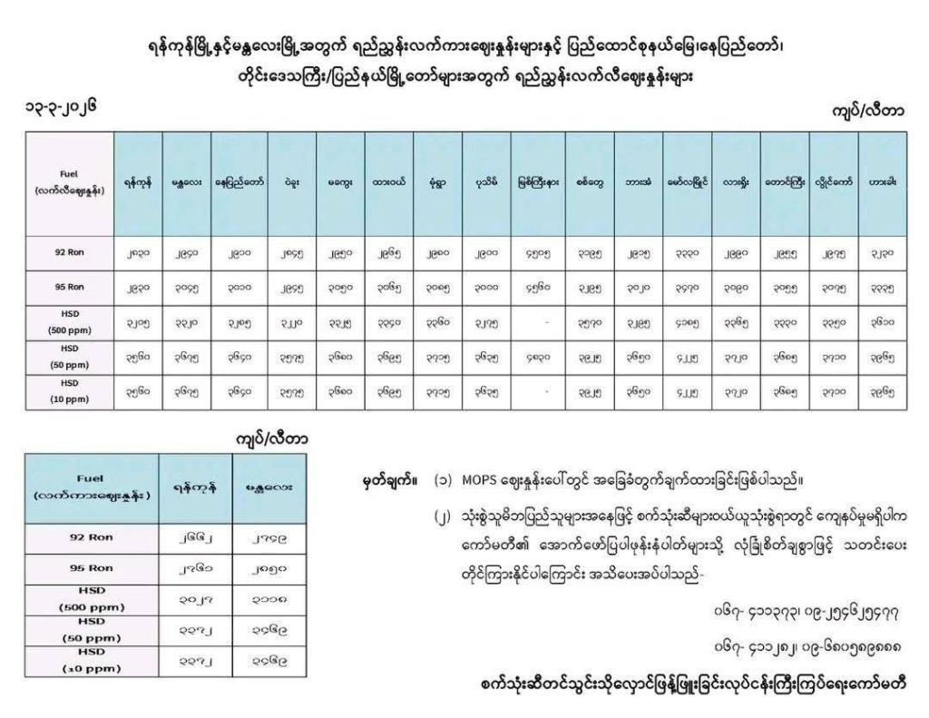နိုင်ငံတော်အစိုးရအနေဖြင့် မြန်မာနိုင်ငံစက်သုံးဆီတင်သွင်းရောင်းချဖြန့်ဖြူးရေးအသင်းတိုဖြင့် ပူးပေါင်းဆောင်ရွက်ကာ စက်သုံးဆီစျေးနှုန်းကို တည်ငြိမ်အောင် ဆောင်ရွက်လျက်ရှိနေသည်ဟု မတ်၁၄ က ထုတ်ပြန်ထားသည်။