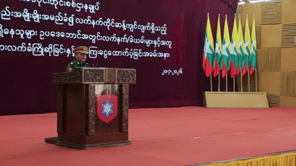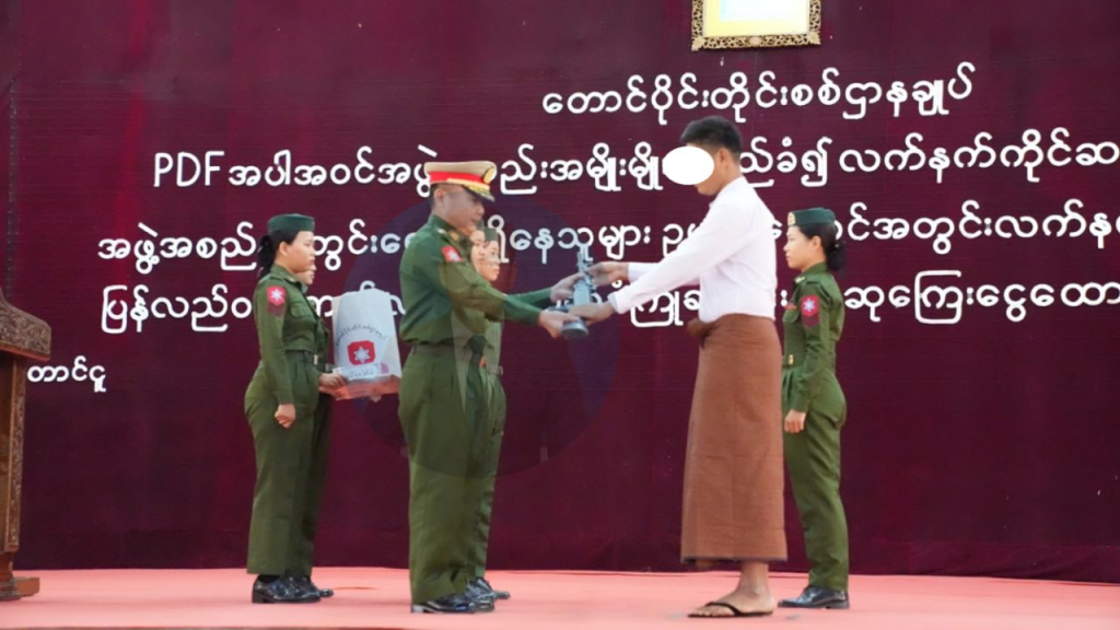 အဆိုပါ PDF အပါအဝင် အဖွဲအစည်းအမျိုးမျိုးအမည်ခံပြီး လက်နက်ကိုင်ဆန့်ကျင်လျက်ရှိတဲ့ အဖွဲအစည်းအတွင်း ရောက်ရှိနေသူများ ဥပဒေဘောင်အတွင်း လက်နက်/ခဲယမ်းများနှင့်အတူ ပြန်လည်ဝင်ရောက်လာမှုအား လက်ခံကြိုဆိုခြင်းနှင့် ဆုကြေးငွေထောက်ပံ့ခြင်းအခမ်းအနားကို တောင်ပိုင်းတိုင်းစစ်ဌာနချုပ်အတွင်းရှိ အေးချမ်းဖြိုးခန်းမမှာ ယနေ့ ဖေဖော်ဝါရီလ (၂၀)ရက် နံနက်ပိုင်းက ကျင်းပပြုလုပ်ခဲ့ပါတယ်။